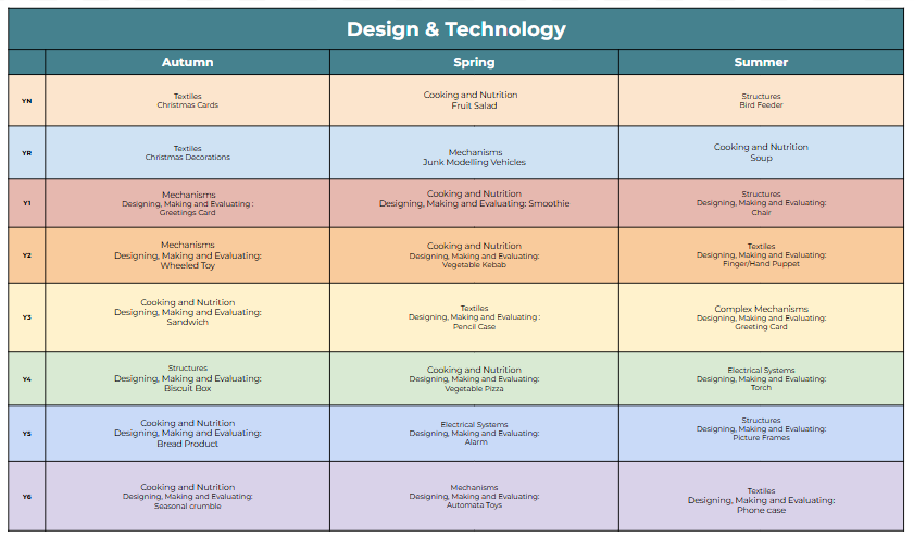 The Design and Technology curriculum offer follows the national curriculum in KS1 and KS2 and the EYFS Statutory Framework and Development Matters in the early years. The Design and Technology curriculum is ambitious and designed to give all learners, particularly the most disadvantaged and those with special educational needs, the knowledge and cultural capital they need to succeed in life. Where required, pedagogy is adapted so that all pupils, including disadvantaged pupils and those with SEND are on the same knowledge journey towards the same endpoints.